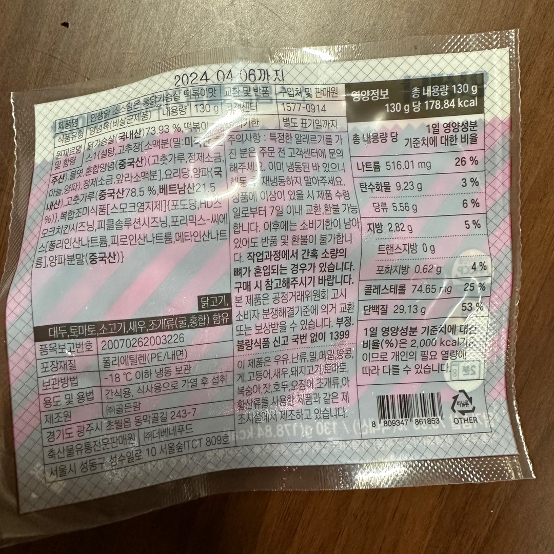 바로 인생닭의 소스담은 통닭가슴살 떡볶이맛입니다. 가격은 개당 2,190원이며 130g로 넉넉하게 포장이 되네요. 국내산 닭을 사용하며, 총 열량은 178.84kcal 입니다.