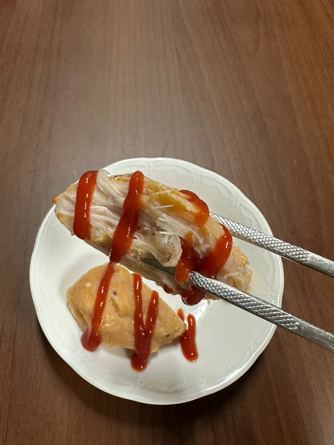 그래서 저도 냅다 냉장고를 뒤져 케찹을 뿌려봤어요. 원래 정석대로라면 저당케찹을 뿌려먹어야 하지만, 뭐 그냥 먹고 까짓거 한 세트 더 하자는 마음으로 즐겨줬는데 훨씬 감질맛 나더라고요. 보기에도 더 맛있어보이죠?