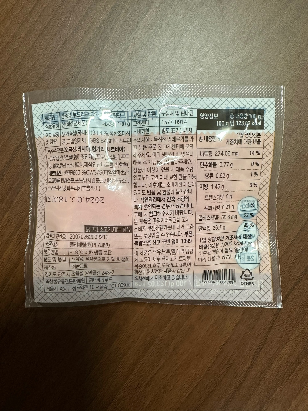 인생닭의 부드러운 닭가슴살 그릴맛인데요. 국내산 닭 94.4%에 100g으로 소분되어있고, 총 열량은 123.02kcal 입니다.