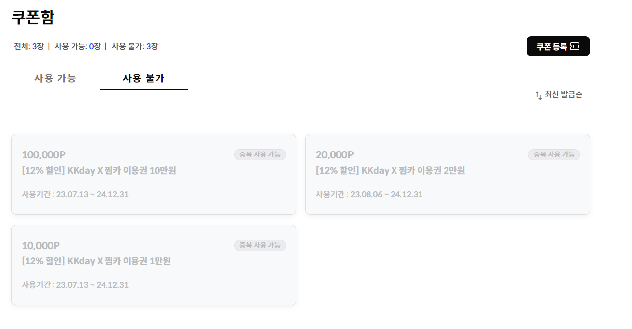 등록까지 해주셨다면 이런 식으로 찜카 쿠폰함에 등록한 쿠폰들이 바로 사용 불가 상태로 전환됩니다.