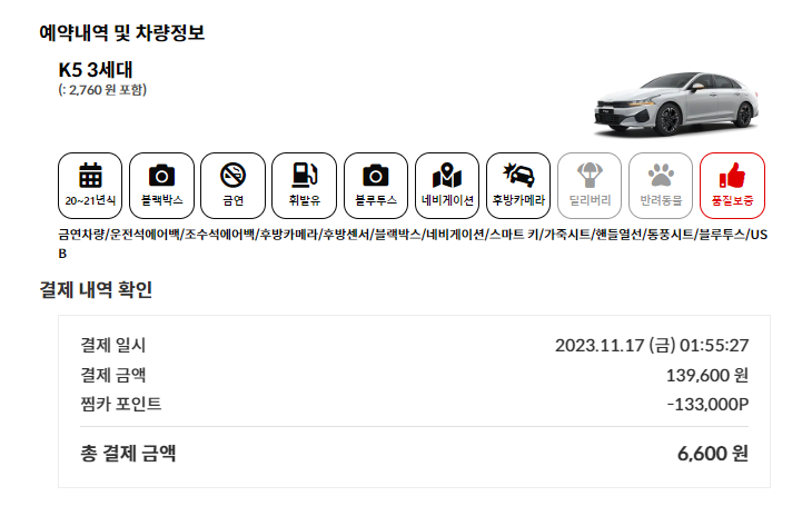 이렇게 옵션이 들어가 있는 차량을 선택했고, 총금액은 139,600원이었습니다.