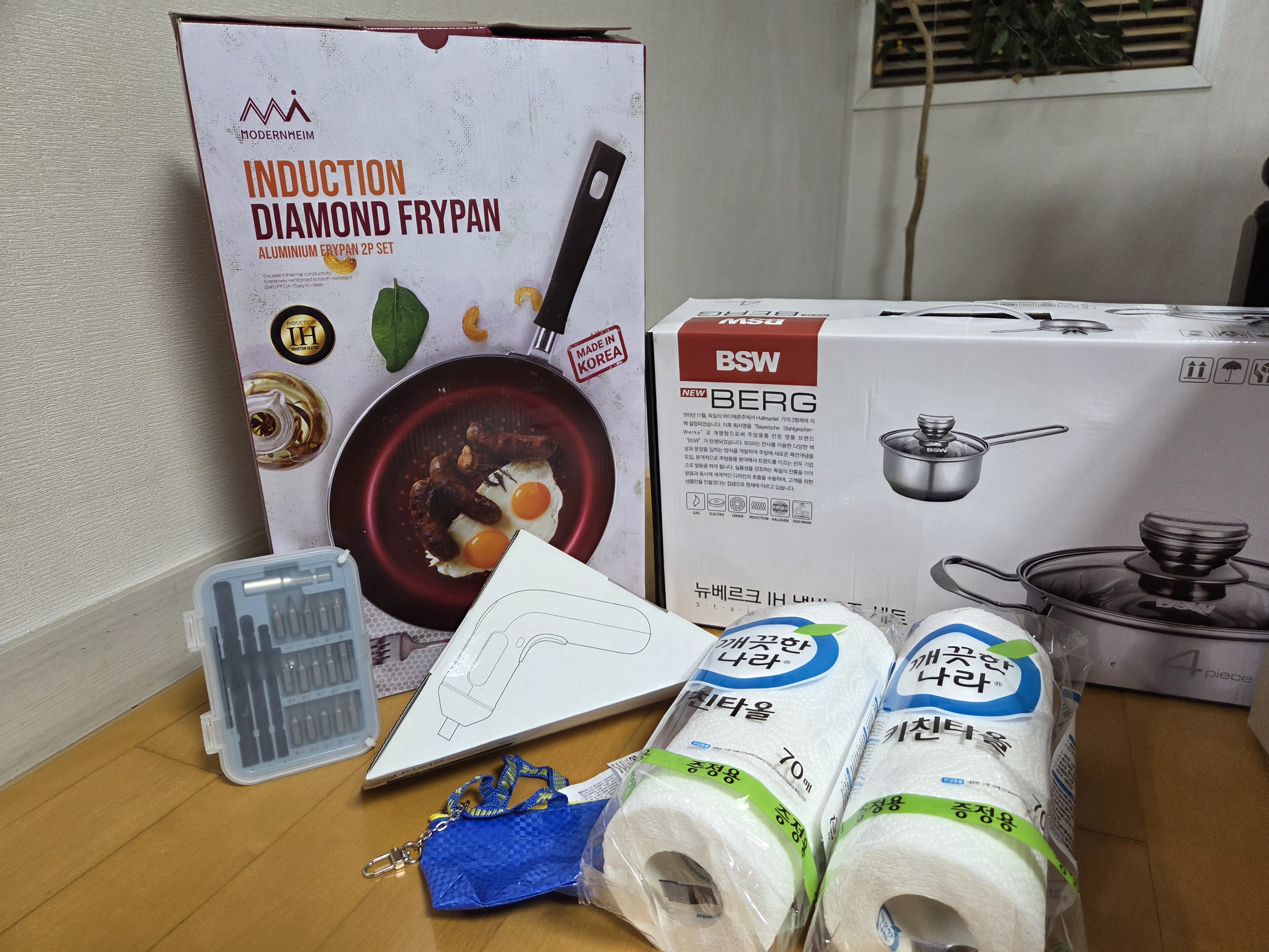 와중에 부지점장님께서 주신 사은품도 정말 많았습니다. 드릴, 프라이팬, 키링, 냄비, 키친타월, 칼 등등.. 저희 살림에 직접적으로 필요한 물건들까지 챙겨주셔서 매우 만족스러웠습니다.